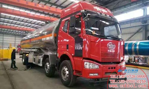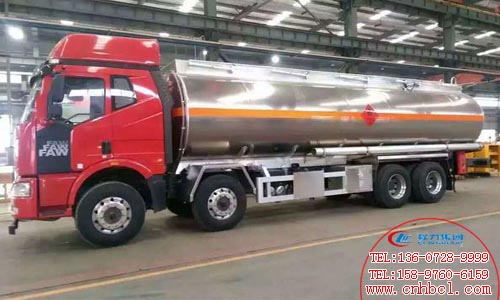 解放前四后八鋁合金油罐車上裝配置:罐體通倉采用鋁合金5182厚7mm、筒體厚6厘、隔板厚5mm。2個歐標罐口,1個海底閥。整套歐(罐中間出料,下裝油,油氣回收)。附件:碳鋼后保險桿,鋁合金副件(活動護欄,1個工具箱,出口箱,側護欄,防滑走道,后爬梯不銹鋼炮筒)。泵進泵出。2個4kg滅火器,3塊告示牌。本色表面拋光打蠟,3M反光帶,條,<爆>字。