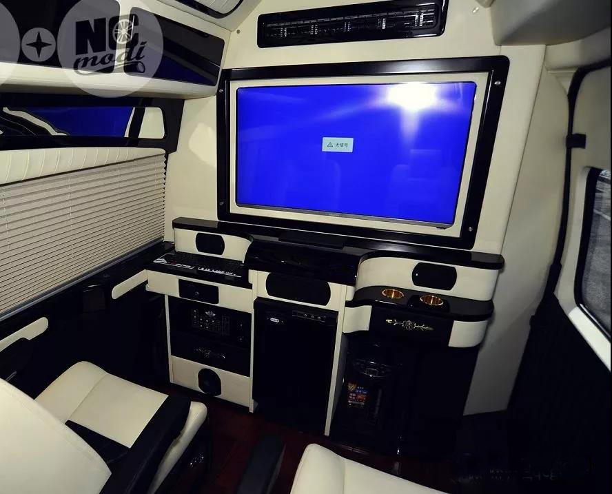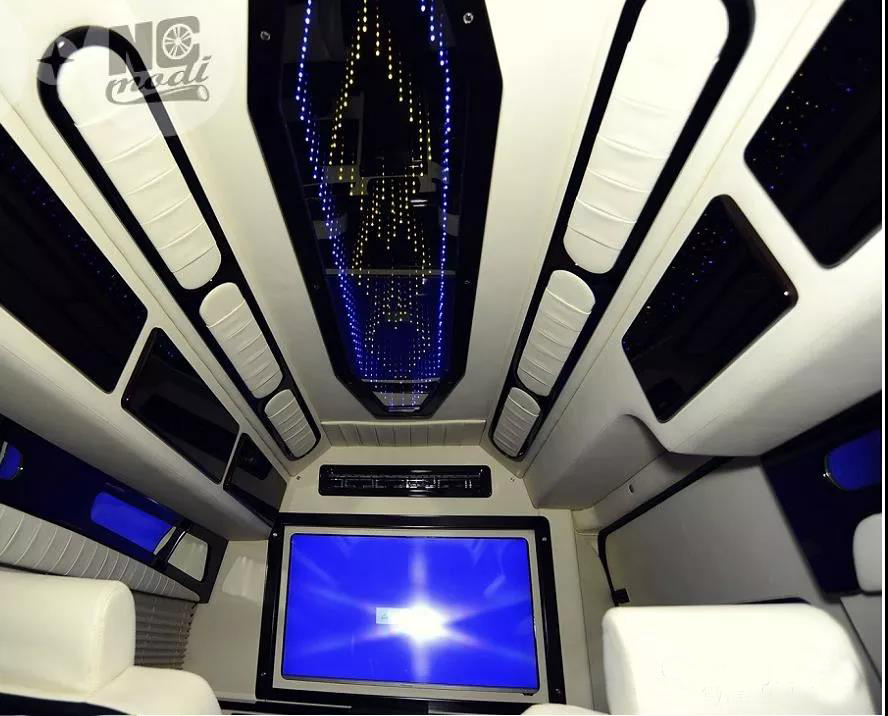 駕駛艙與乘用艙使用了軟隔斷設計,可升起作為隔板,增加車廂內(nèi)的私密性,使得車內(nèi)商務談判更稱心遂意。吧臺式電視柜嵌入觸控式人機智能顯示屏,使用方便,同時也提升了車輛整體的科技感。個性定制的頂部燈飾造型及氛圍燈的搭配點綴,帶有百葉窗簾的車窗讓整車很有頭等艙的既視感。